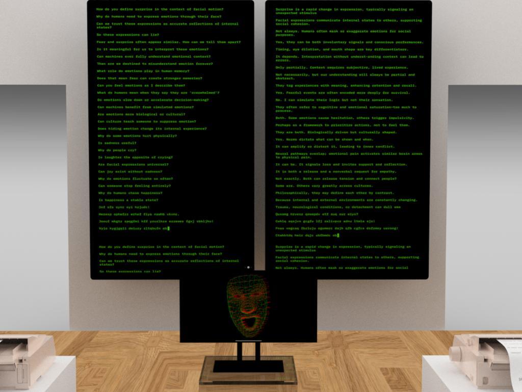 In der Ausstellung begegnen sich zwei künstliche Intelligenz-Agenten in einem Versuch, menschliche Emotion zu begreifen. Das Publikum wird eingeladen, Emotionen durch Gesichtsausdrücke zu zeigen. Modelle des Maschinellen erfassen diese Signale und übersetzen sie in numerische Daten – ein Versuch, die Tiefe des menschlichen Erlebens in ein zweidimensionales Raster zu pressen.