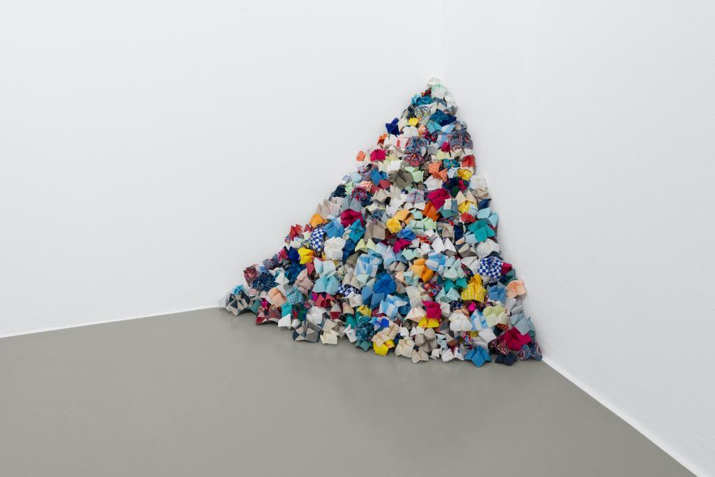 Die drei Werkserien im Innenraum basieren auf kleinen Stoffresten. Vorsichtig herausgelöste Fäden lassen in Gewebe und Mustern fragile Bilder von Verlust, aber auch Offenheit entstehen. Die gewonnenen Fäden wiederum hat Hamid in kleinen Kreisen auf Papiere gestickt und ihnen eine neue, stark verdichtete Präsenz gegeben. Es entstehen Codes, die an Lochkarten und automatisierte Webstühle erinnern lassen, sich der binären Entweder-oder-Logik und automatisierten Lesarten jedoch verwehren. Hamids Karten tragen konzentrierte Informationen, deren Vielzahl von Fäden darauf warten, auf offenere Weise ausgelesen zu werden. In einer Ecke häufen sich tausend aus Stoff gefaltete „fortune teller“ wie bei Félix Gonzalez-Torres die Bonbons. Auch Hamid lädt die Besucher:innen ein, sich eines der kleinen Fingerspiele mitzunehmen. Die „fortune teller“, die im Deutschen Himmel und Hölle heißen, dienen dem Vorhersagen einer Zukunft. Üblicherweise enthalten sie vorgegebene Möglichkeiten, hier aber sind sie unbeschrieben und eine Einladung zum taktilen Bewegen unendlicher, vorstellbarer Möglichkeiten und zum Tagträumen.