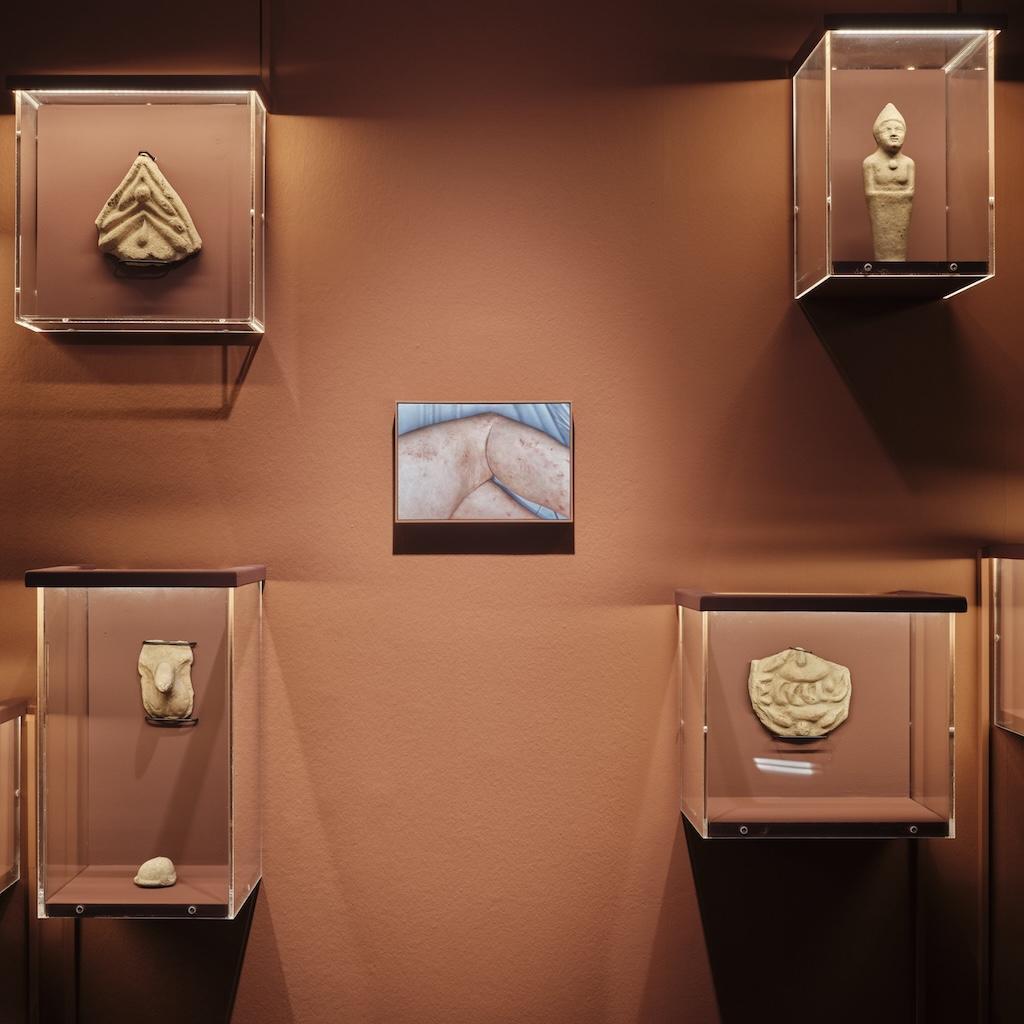 Der Frankfurter Kunstverein hat die Zusammenarbeit mit dem Universitätsklinikum Frankfurt gesucht. Aus der Sammlung der Klinik für Dermatologie, Venerologie und Allergologie, Universitätsmedizin der Goethe-Universität Frankfurt sind naturgetreue Wachsmodelle von Hautkrankheiten und - verletzungen zu sehen. Die sogenannten Moulagen sind aus Wachs geformte, dreidimensionale und naturgetreue Nachbildungen von Körperteilen, die zur medizinischen Ausbildung dienen. Anders als bei den anatomischen Wachsmodellen aus der italienischen Tradition, die idealisierte und anonyme Körper darstellten, bewahren Moulagen das genaue Abbild einer echten, individuellen Person. Sie sind so das Abbild von Körperfragmenten, das die Spuren eines realen Menschen und seiner einmaligen Leidensgeschichte trägt – und gleichzeitig die Voraussetzung für die Weitergabe von Wissen in der Medizin.