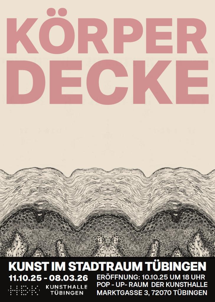 Unter dem Motto Körperdecke werden in der neuen Spielstätte der Kunsthalle, in der Marktgasse 3, sowie an weiteren ausgewählten Orten im Stadtraum von Tübingen ab dem 11. Oktober 2025 Arbeiten und künstlerische Interventionen von Studierenden der HBKsaar, Saarbrücken, der Öffentlichkeit präsentiert.