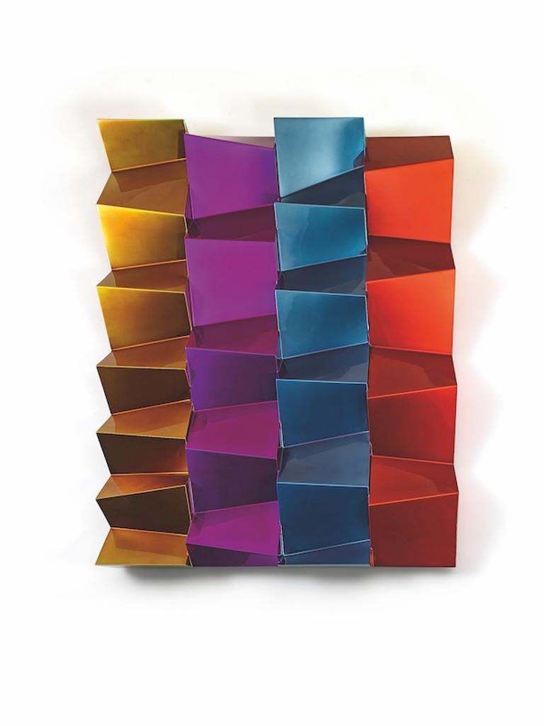 In einer weiteren Werkserie scheinen die durchbrochenen Farbflächen aus eingefärbtem Epoxidharz auf einem Bett aus Nägeln zu schweben. Auch erscheint das Material fast flüssig und spielt mit den Seherfahrungen der Betrachter*innen.