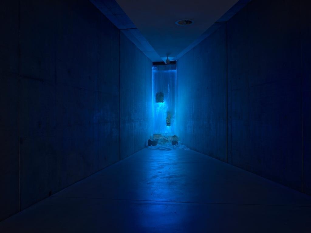 In die Spitze des KIT hat die Künstlerin einen Wasserfall gebaut: mit hellem Blau und leisem Rauschen schafft Betonrausch eine Verbindung zwischen Natur und dem kühlen Beton des Raumes sowie dem Rauschen des Verkehrs hinter den Tunnelwänden.