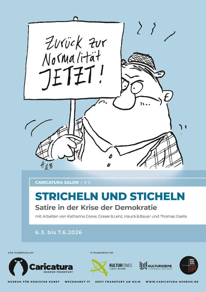 In einer Demokratie, die durch akute Bedrohungen, insbesondere von rechts, unter Druck geraten ist, steht unsere Gesellschaft vor großen Herausforderungen. Es gilt eine stabile Grundordnung und ein Miteinander zu sichern, das auf Respekt und humanistischen Grundwerten basiert. Das Mittel der Satire kann Türöffner für Gespräche und Impulsgeber für Diskussionen über die gesellschaftliche Lage sein. Das stellt auch die neue Ausstellung „Stricheln und Sticheln“ unter Beweis: Cartoons über den gegenwärtigen Zustand der Demokratie in Deutschland von Katharina Greve, Greser & Lenz und Hauck & Bauer sowie Gedichte des Autors Thomas Gsella laden in gewohnt humorvoller und unterhaltsamer Manier zum Perspektivwechsel und kritischem Diskurs ein.