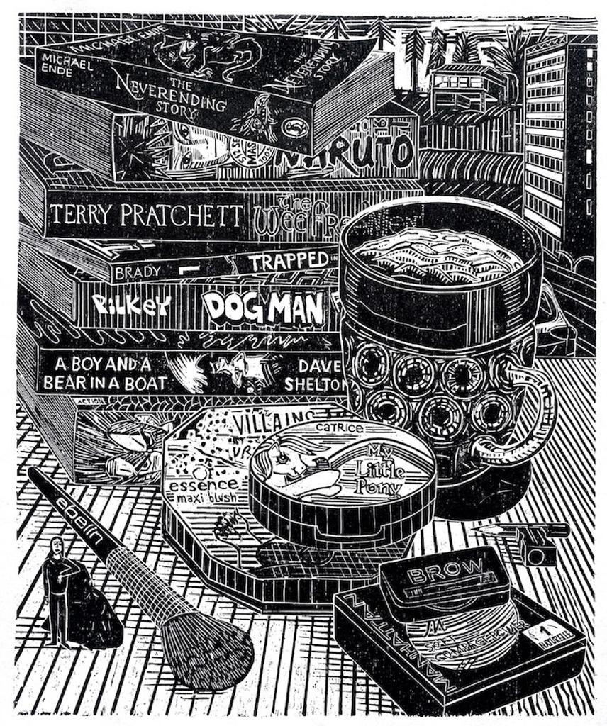 Gabriela Jolowicz’ Arbeiten, die Anklänge an Comics und Graphic Novels tragen, zeigen, wie lebendig und überraschend zeitgemäß der Holzschnitt sein kann – gerade weil er auf den ersten Blick nicht zu digitalen, flüchtigen Bildwelten zu passen scheint. Ihre Motive entstammen alltäglichen Situationen, urbanen Räumen, privaten Umgebungen sowie digitalen Bildquellen. Hinzu kommen gezielte Bezüge zur Kunstgeschichte, die sie in ihre Bildwelten integriert. Häufig greift die Künstlerin historische Bildmotive oder Porträts auf und überführt sie in zeitgenössische Kontexte. Figuren wie der Maler Max Beckmann erscheinen in heutigen Stadträumen – etwa in der Arbeit „Beckmann vorm IhmeZentrum“ –, in öffentlichen Verkehrsmitteln oder urbanen Alltagsszenen.