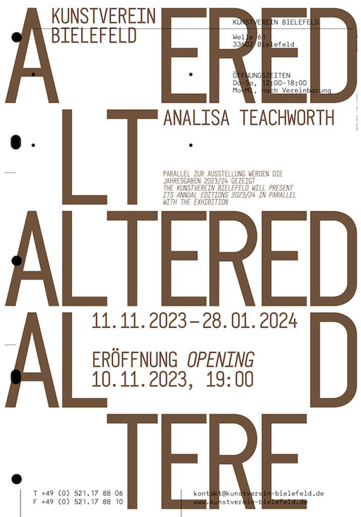 Die multidisziplinäre Praxis Analisa Teachworths (*1987 in Detroit, lebt und arbeitet in Berlin und New York City) erstreckt sich auf die Felder Malerei, Skulptur, Installation, Sound und digitale Medien. Dabei gehen ihren Arbeiten stets fundierte inhaltliche Recherchen voraus. Zwischen Sanftheit und Raserei vermitteln ihre Kunstwerke mit besonderer Klarheit die ganze Härte der uns umgebenden Realität, und es sind insbesondere ihre Oberflächen, deren taktile Momente von magischer Qualität zeugen. Transition, Kollektivismus und Kommunikation sind wiederkehrende Themen, denen sich die Künstlerin widmet. Auch der Ausstellung Altered im Kunstverein Bielefeld geben sie ihr Fundament.