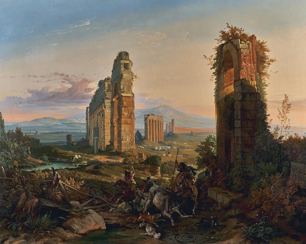 Höhepunkt der Ausstellung ist das Gemälde „Campagnalandschaft mit Aqua Claudia“. Jahrzehntelang schlummerte das Hauptwerk im Depot und war ein schwerer Fall für die Restaurierung. Erst eine großzügige Spende ermöglichte die aufwendige Wiederherstellung. Das Motiv der imposanten Ruinen des Aquädukts vor den Toren Roms war damals neu und spektakulär. Denn bis dahin galt die Campagna als öde und gefährlich, wegen der Räuber und Malaria. Man durchquerte diese Gegend möglichst schnell, ohne die historischen Ruinen besonders zu würdigen. Nerly war einer der ersten, der sie zum Hauptmotiv eines Gemäldes machte.