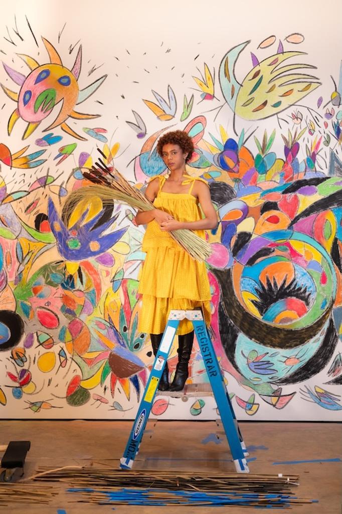 Tadáskías Rauminstallation ist eine Einladung zum Träumen, auch in Zeiten, in denen Träume weit entfernt zu sein scheinen. Tadáskías Skulpturen entstehen aus Taboa, einer schilfähnlichen Pflanze, die traditionell in Afro-brasilianischen Gemeinschaften als Baumaterial und Heilpflanze verwendet wird. Aus diesem strohähnlichen Material formt sie kleine, verflochtene Skulpturen, die wie lebendige Wesen – Hundertfüßer oder zeremonielle Konfigurationen – über eine mit Pastell kolorierte Plattform wandern. In Kombination mit Gemüse, Früchten und Gläsern mit Flüssigkeiten erweitern die dreidimensionalen Arbeiten die Wandzeichnung und das Gedicht zu einem kaleidoskopischen Feld intuitiver Bewegungen und körperlicher Präsenz. Hier wird Vergänglichkeit zum zentralen Motiv: Die Früchte werden austrocknen, das Taboa wird zerfallen, die Flüssigkeiten werden verdunsten. Das Werk wird nur mit Liebe und Fürsorge lebendig gehalten – ermöglicht durch Menschen, ermöglicht vom Museum.