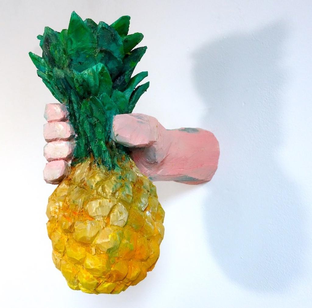 Im Zentrum der Ausstellung Unterirdisches Heimweh stehen Hände, die direkt aus der Wand in den Raum greifen. Sie halten Objekte wie eine Ananas, ein Auto oder eine Figur – scheinbar beiläufig, zugleich voller Anspielungen auf Konsum, Rollenbilder und Popkultur. Manche Motive entstammen Wagenblasts Alltag, andere verweisen auf Reisen in die USA oder nach Taiwan. So entstehen Episoden einer offenen Erzählung, die Betrachterinnen und Betrachter für sich weiterspinnen können.
